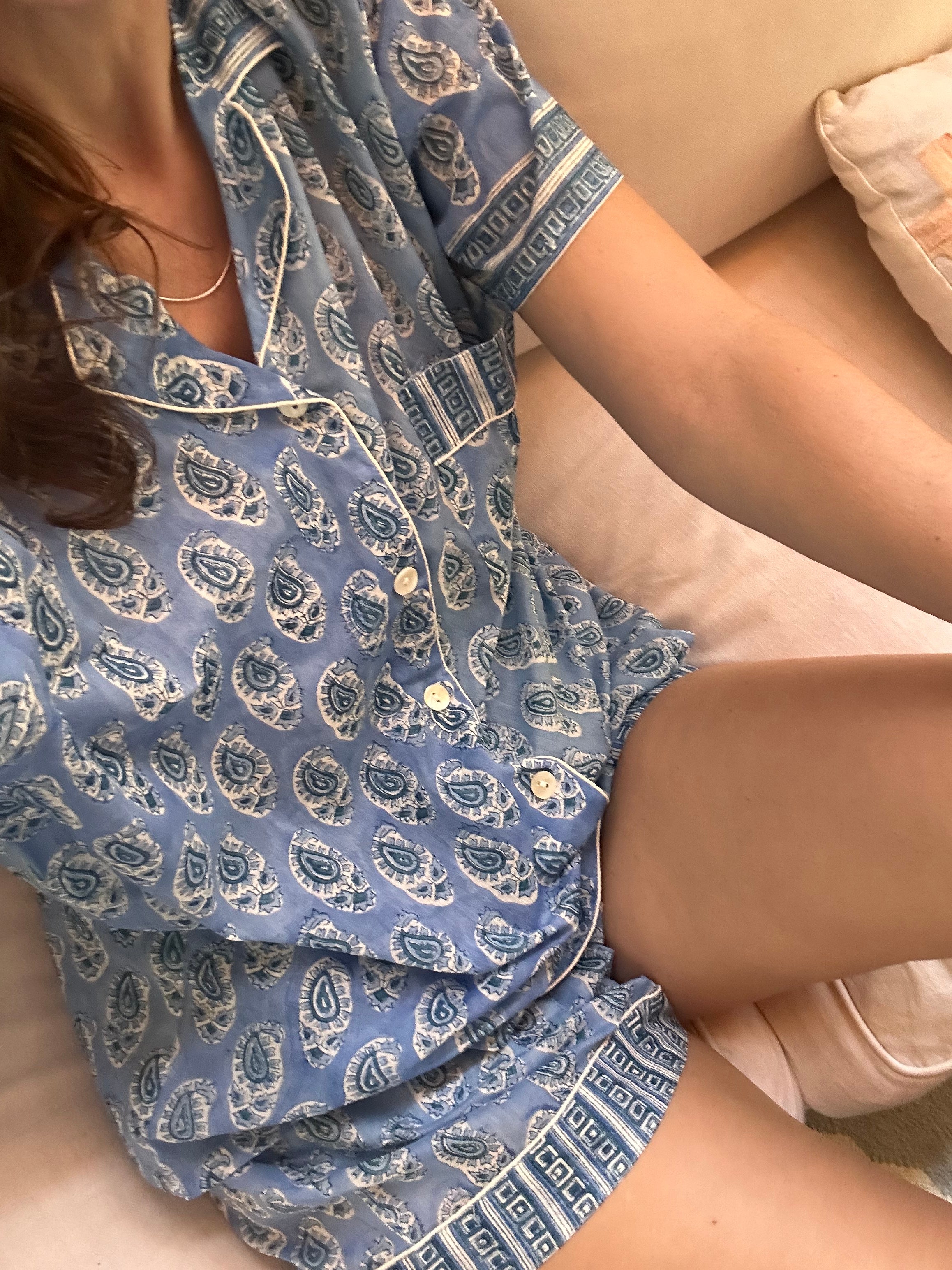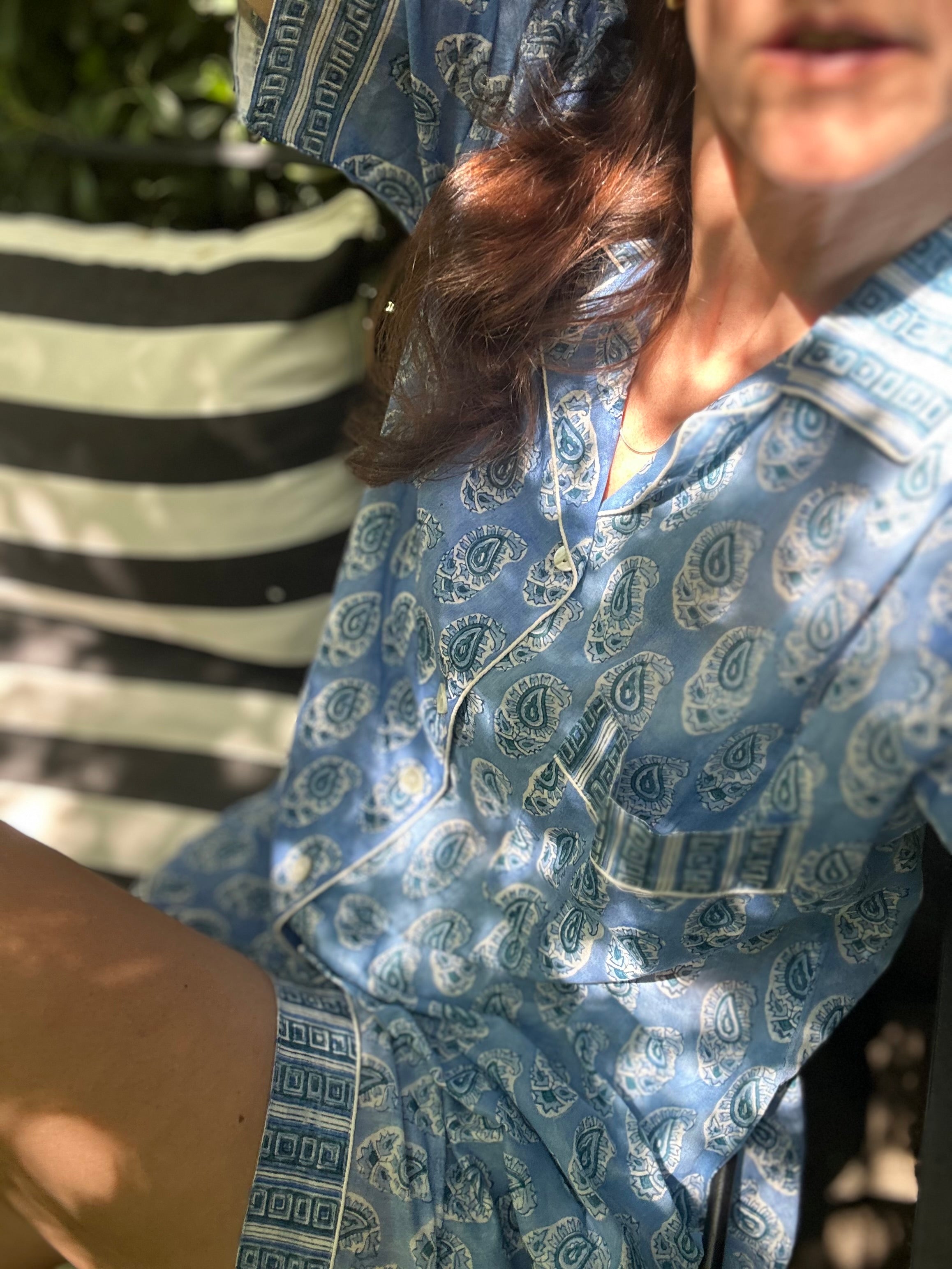 Pijama 100% algodón Indio estampado a mano con bloques de madera. Mangas cortas, short y 1 bolsillo a la altura de la pecho, abotonado. Pantalón Bolsa de Tela 100% algodón - Hecho...