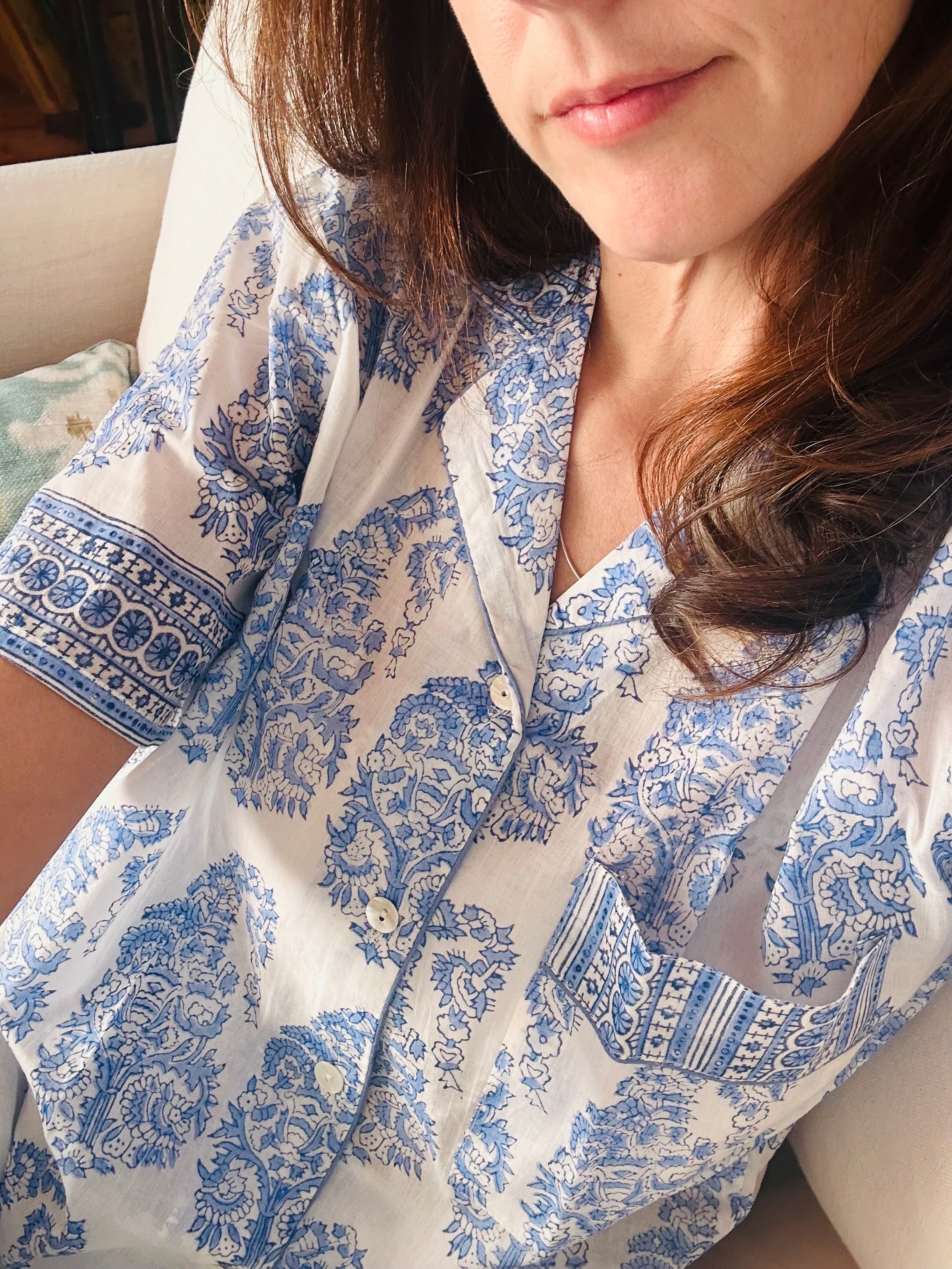 Pijama 100% algodón Indio estampado a mano con bloques de madera. Mangas cortas, short y 1 bolsillo a la altura de la pecho, abotonado. Pantalón Bolsa de Tela 100% algodón - Hecho...